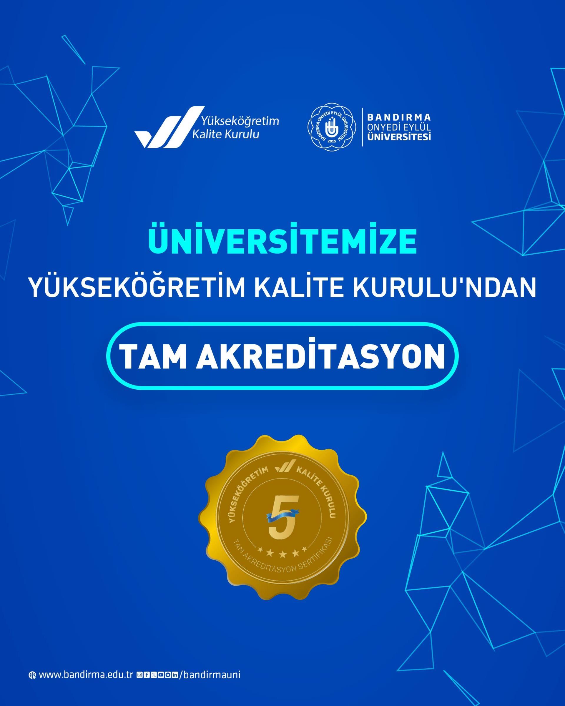 Üniversitemiz, Yükseköğretim Kalite Kurulu (YÖKAK) tarafından yürütülen Kurumsal Akreditasyon Programı (KAP) kapsamında gerçekleştirilen kapsamlı ve çok boyutlu değerlendirmeler sonucunda “5 yıl süreyle Tam Akreditasyon” almaya hak kazanmıştır.